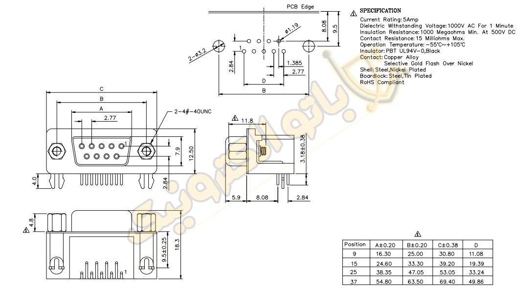 کانکتور DB15 مادگی روبردی رایت | کانکتور زاویه‌دار مادگی برای برد PCB - باتوالکترونیک